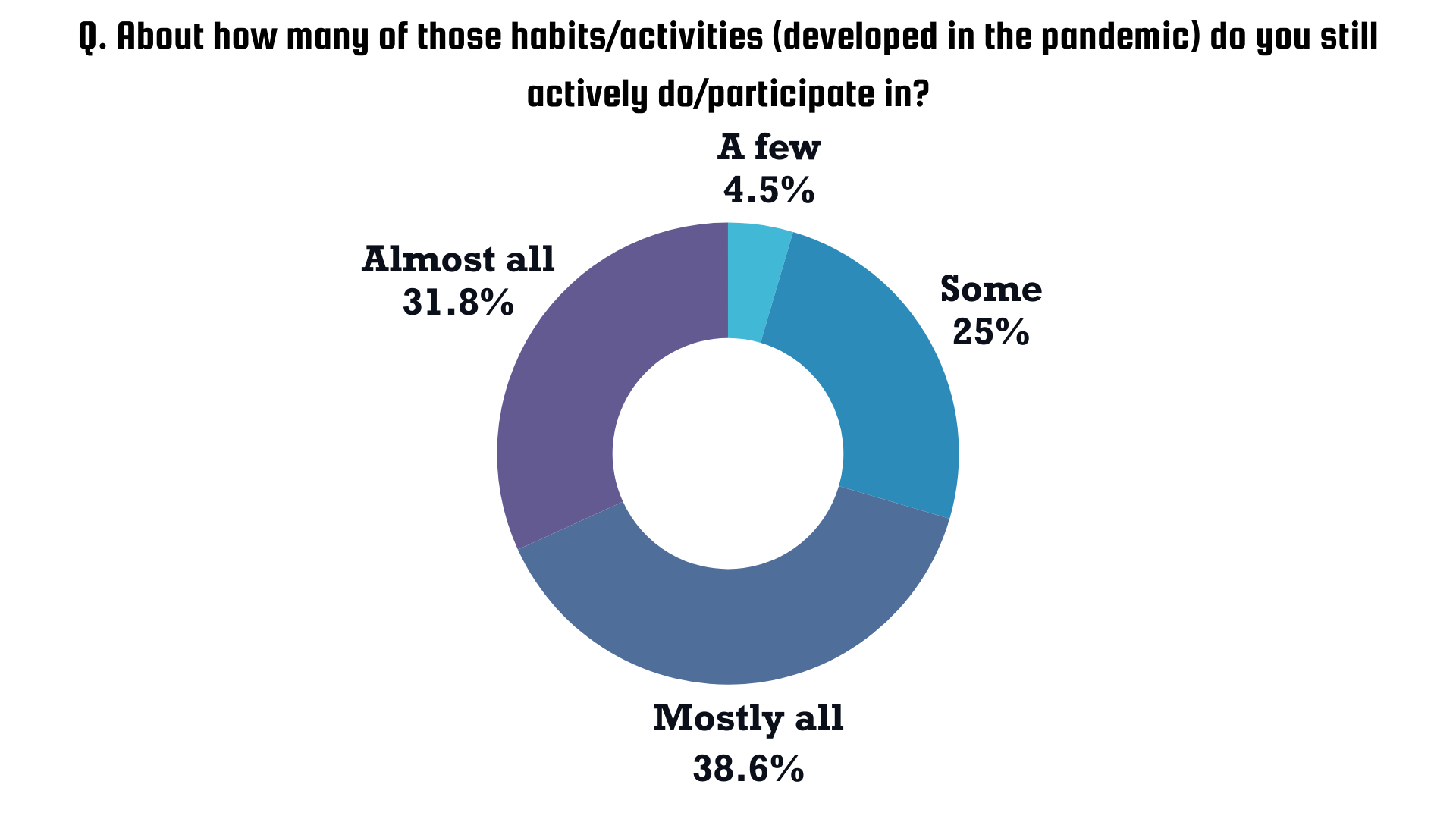 The extent to which these habits/activities are still present are extremely dependent on the person. So many factors play into it such as mental health, household experiences, outside support, and more. Three respondents to Rampage’s poll mentioned that they still participate in the activities they picked up during the pandemic to pass the time. However, on the other side, three respondents also say they are busier now, so they don’t have as much time to do them. However, the most commonly agreed-upon idea is that we still participate in majority of the activities, hobbies, and habits that we developed during the pandemic. Out of 44 students, a combined 70.4% say that they participate in most to all of them, based on a scale of one to five.